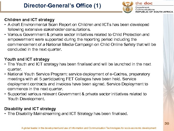Director-General’s Office (1) Children and ICT strategy • A draft Environmental Scan Report on Children and ICTs has been developed following extensive stakeholder consultations. • Various Government & private sector initiatives related to Child Protection and empowerment were supported during the reporting period including the commencement of a National Media Campaign on Child Online Safety that will be concluded in the next quarter. Youth and ICT strategy • The Youth and ICT strategy has been finalised and will be launched in the next quarter. • National Youth Service Program: service deployment of e-Cadres, preparatory meetings with all 5 participating FET Colleges have been held. Service deployment contracts and invoices have been signed. Service Deployment to commence in the next quarter. • Supported various relevant Government & private sector initiatives related to Youth Development. Disability and ICT strategy • The Disability Mainstreaming and ICT Strategy has been finalised. 30 A global leader in the development and use of Information and Communication Technologies for socio-economic development