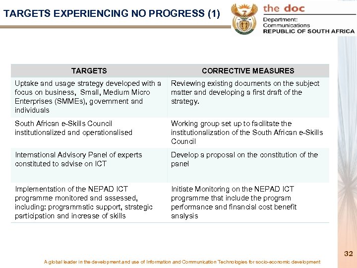 Director-General’s Office (2) Gender and ICT strategy • The first draft of Gender and ICT Framework that will form the basis for the strategy development process has been finalized. • The Gender Audit has been finalised. • With regards to the Mobinet Project, a draft Mo. U with Women’s Net has been developed. Risk Management • A draft Risk Management Strategy has been developed. • The process of conducting risk assessments and the development of a risk register has commenced. • Control assessment audit was performed on the Human Resource Administration processes. 31 A global leader in the development and use of Information and Communication Technologies for socio-economic development