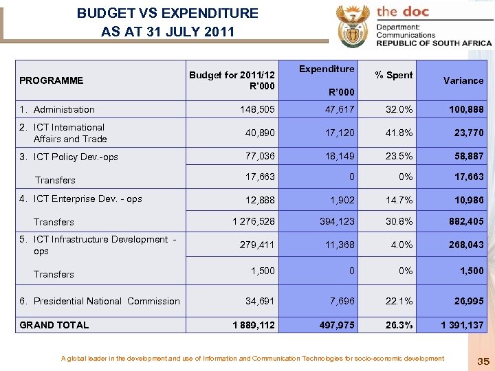 BUDGET VS EXPENDITURE AS AT 31 JULY 2011 34 A global leader in the development and use of Information and Communication Technologies for socio-economic development