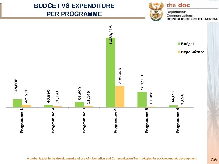 BUDGET VS EXPENDITURE AS AT 31 JULY 2011 PROGRAMME 1. Administration Budget for 2011/12 R’ 000 Expenditure % Spent Variance R’ 000 148, 505 47, 617 32. 0% 100, 888 2. ICT International Affairs and Trade 40, 890 17, 120 41. 8% 23, 770 3. ICT Policy Dev. -ops 77, 036 18, 149 23. 5% 58, 887 17, 663 0 0% 17, 663 12, 888 1, 902 14. 7% 10, 986 1 276, 528 394, 123 30. 8% 882, 405 279, 411 11, 368 4. 0% 268, 043 1, 500 0 0% 1, 500 34, 691 7, 696 22. 1% 26, 995 1 889, 112 497, 975 26. 3% 1 391, 137 Transfers 4. ICT Enterprise Dev. - ops Transfers 5. ICT Infrastructure Development - ops Transfers 6. Presidential National Commission GRAND TOTAL A global leader in the development and use of Information and Communication Technologies for socio-economic development 35