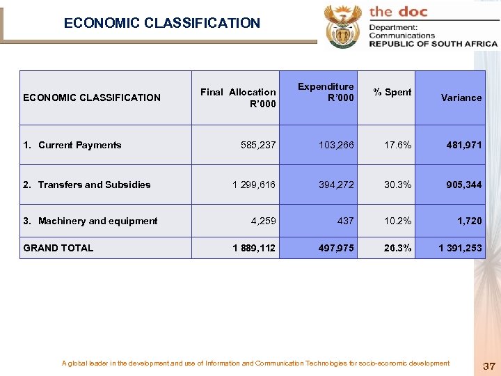 ECONOMIC CLASSIFICATION 1. Current Payments 2. Transfers and Subsidies 3. Machinery and equipment GRAND TOTAL Expenditure R’ 000 % Spent 585, 237 103, 266 17. 6% 481, 971 1 299, 616 394, 272 30. 3% 905, 344 4, 259 437 10. 2% 1, 720 1 889, 112 497, 975 26. 3% 1 391, 253 Final Allocation R’ 000 Variance A global leader in the development and use of Information and Communication Technologies for socio-economic development 37