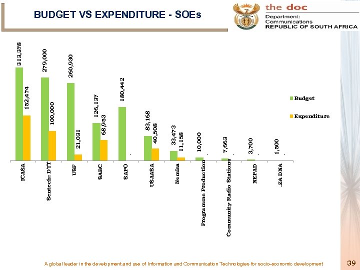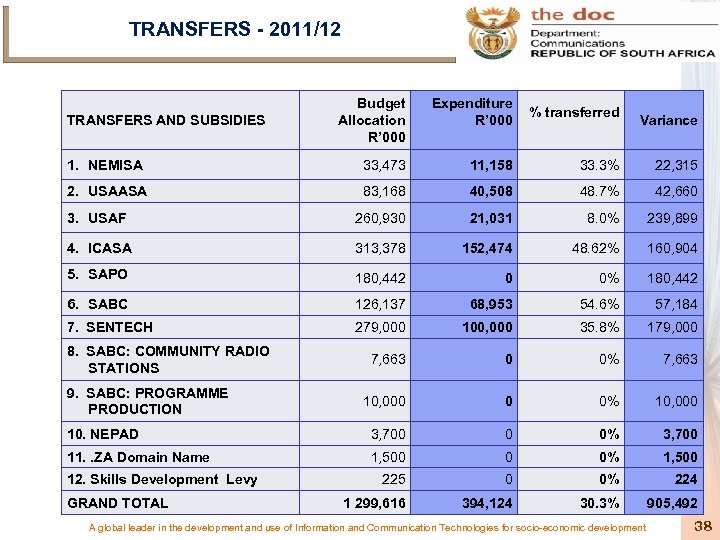 TRANSFERS - 2011/12 Budget Allocation R’ 000 Expenditure R’ 000 % transferred 1. NEMISA 33, 473 11, 158 33. 3% 22, 315 2. USAASA 83, 168 40, 508 48. 7% 42, 660 3. USAF 260, 930 21, 031 8. 0% 239, 899 4. ICASA 313, 378 152, 474 48. 62% 160, 904 5. SAPO 180, 442 0 0% 180, 442 6. SABC 126, 137 68, 953 54. 6% 57, 184 7. SENTECH 279, 000 100, 000 35. 8% 179, 000 7, 663 0 0% 7, 663 10, 000 0 0% 10, 000 10. NEPAD 3, 700 0 0% 3, 700 11. . ZA Domain Name 1, 500 0 0% 1, 500 225 0 0% 224 1 299, 616 394, 124 30. 3% 905, 492 TRANSFERS AND SUBSIDIES 8. SABC: COMMUNITY RADIO STATIONS 9. SABC: PROGRAMME PRODUCTION 12. Skills Development Levy GRAND TOTAL Variance A global leader in the development and use of Information and Communication Technologies for socio-economic development 38