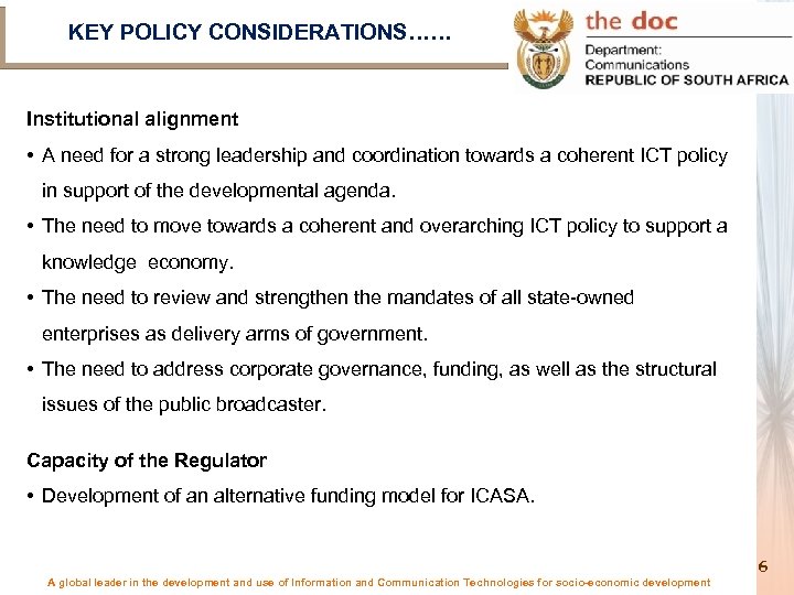 KEY POLICY CONSIDERATIONS……. . Growth • The development of a competitive ICT industry is crucial for the long-term development of the country. • The development of an overarching strategy to develop manufacturing capabilities of ICT-related devices and software applications. • Creating green ICT products and services markets in support of an eco-friendly economic growth. Job Creation • Unlocking the potential of the industry to create jobs. Skills Development • Establishment of E-skills Institute. 5 A global leader in the development and use of Information and Communication Technologies for socio-economic development