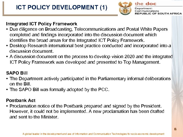 CASCADING OUR STRATEGY 2011 -2014 Strategic Plan Quarterly Reporting 2011/12 Branch Business Plans & Budget 2011/12 Operational Plans / Project Plans 3 year targets 1 year target & milestones Activities & deliverables 2011/12 Individual Performance Agreements 7 A global leader in the development and use of Information and Communication Technologies for socio-economic development