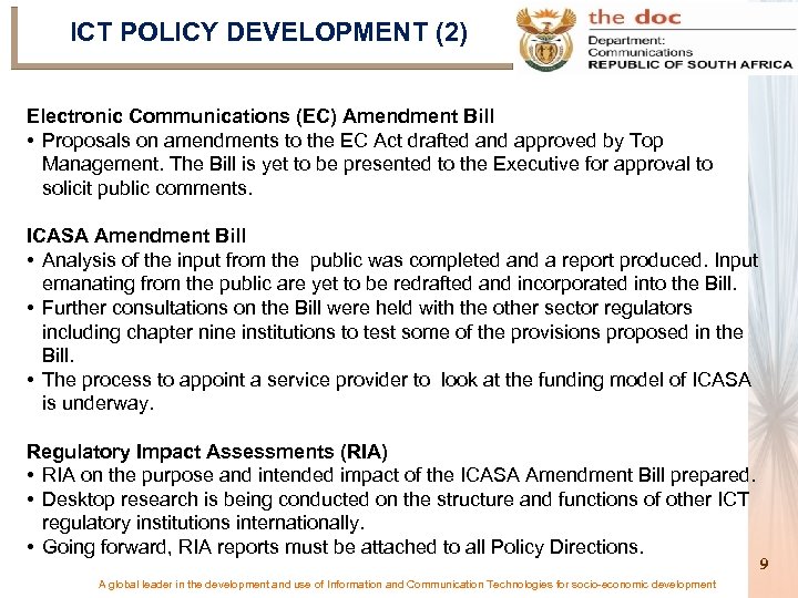 ICT POLICY DEVELOPMENT (1) Integrated ICT Policy Framework • Due diligence on Broadcasting, Telecommunications and Postal White Papers completed and findings incorporated into the discussion document which identifies the broad areas for the Integrated ICT Policy Framework. • Desktop Research international best practice conducted and incorporated into a discussion document. • A discussion document on the process to develop vision 2020 and the integrated ICT Policy Framework was developed and presented to Top Management. SAPO Bill • The Department actively participated in the Parliamentary informal deliberations on the Bill. • The SAPO Bill was formally adopted by the PCC. Postbank Act • Proclamation notice of the Postbank prepared and signed by the President. However, it could not be implemented. A new proclamation has been drafted and sent to the Minister. 8 A global leader in the development and use of Information and Communication Technologies for socio-economic development
