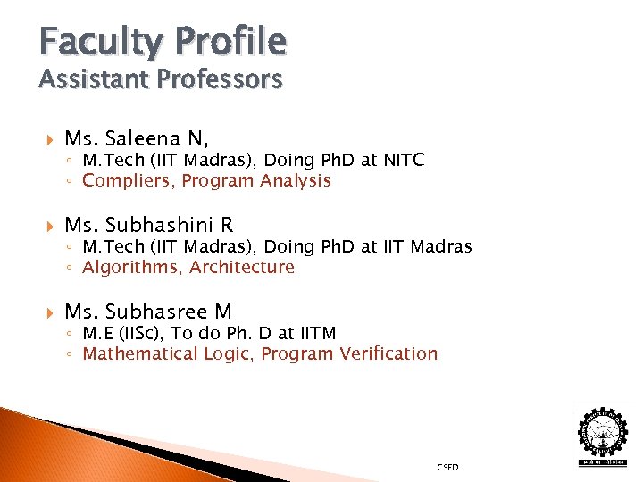 Faculty Profile Assistant Professors Ms. Saleena N, Ms. Subhashini R Ms. Subhasree M ◦ M. Tech (IIT Madras), Doing Ph. D at NITC ◦ Compliers, Program Analysis ◦ M. Tech (IIT Madras), Doing Ph. D at IIT Madras ◦ Algorithms, Architecture ◦ M. E (IISc), To do Ph. D at IITM ◦ Mathematical Logic, Program Verification CSED