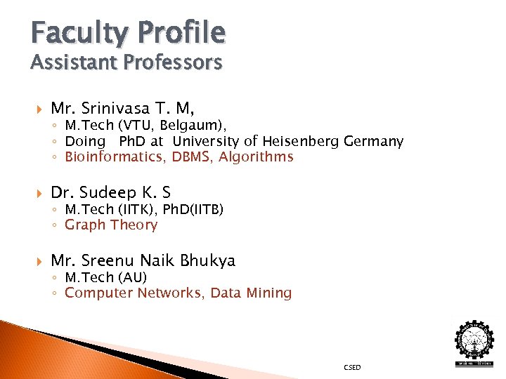 Faculty Profile Assistant Professors Mr. Srinivasa T. M, Dr. Sudeep K. S Mr. Sreenu Naik Bhukya ◦ M. Tech (VTU, Belgaum), ◦ Doing Ph. D at University of Heisenberg Germany ◦ Bioinformatics, DBMS, Algorithms ◦ M. Tech (IITK), Ph. D(IITB) ◦ Graph Theory ◦ M. Tech (AU) ◦ Computer Networks, Data Mining CSED