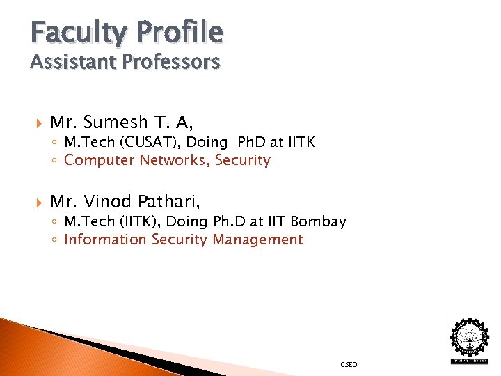 Faculty Profile Assistant Professors Mr. Sumesh T. A, ◦ M. Tech (CUSAT), Doing Ph. D at IITK ◦ Computer Networks, Security Mr. Vinod Pathari, ◦ M. Tech (IITK), Doing Ph. D at IIT Bombay ◦ Information Security Management CSED