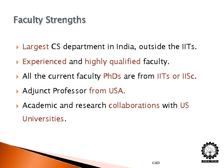 Faculty Strengths Largest CS department in India, outside the IITs. Experienced and highly qualified faculty. All the current faculty Ph. Ds are from IITs or IISc. Adjunct Professor from USA. Academic and research collaborations with US Universities. CSED