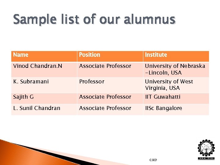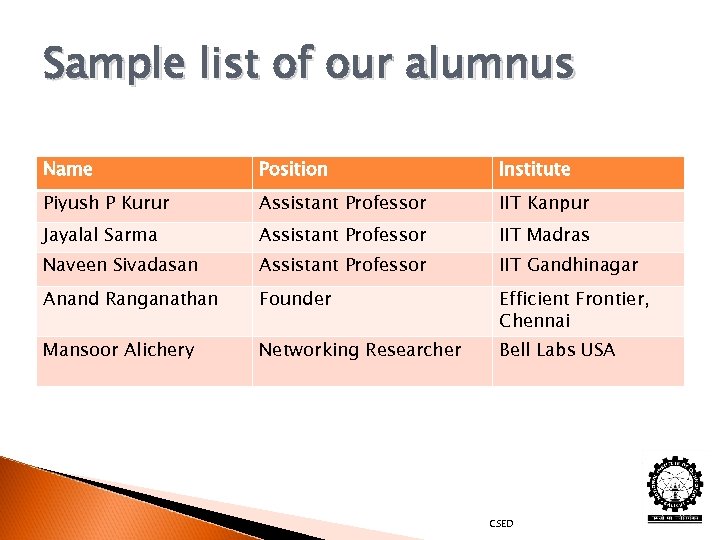 Sample list of our alumnus Name Position Institute Piyush P Kurur Assistant Professor IIT Kanpur Jayalal Sarma Assistant Professor IIT Madras Naveen Sivadasan Assistant Professor IIT Gandhinagar Anand Ranganathan Founder Efficient Frontier, Chennai Mansoor Alichery Networking Researcher Bell Labs USA CSED