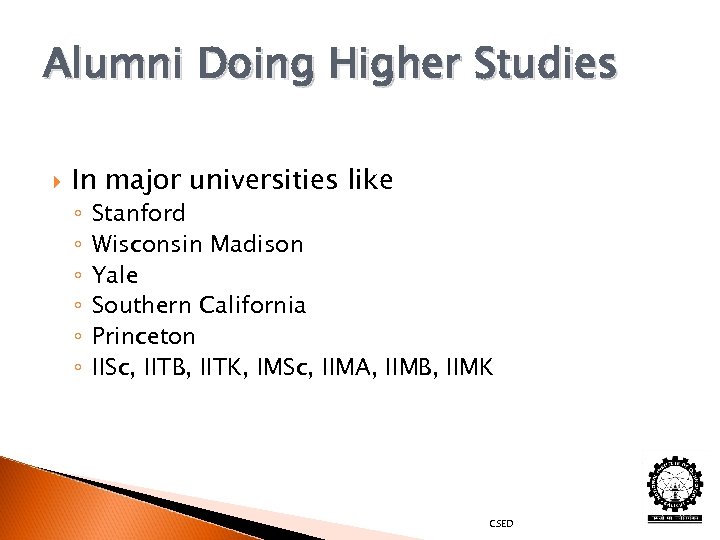 Alumni Doing Higher Studies In major universities like ◦ ◦ ◦ Stanford Wisconsin Madison Yale Southern California Princeton IISc, IITB, IITK, IMSc, IIMA, IIMB, IIMK CSED
