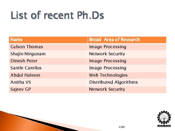 List of recent Ph. Ds Name Broad Area of Research Gylson Thomas Image Processing Shajin Nirgunam Network Security Dinesh Peter Image Processing Santle Camilus Image Processing Abdul Haleem Web Technologies Anitha VS Distributed Algorithms Sajeev GP Network Security CSED