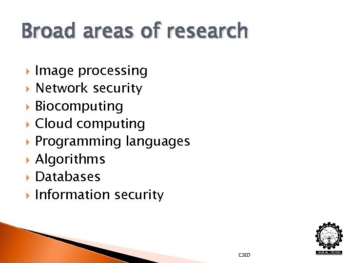 Broad areas of research Image processing Network security Biocomputing Cloud computing Programming languages Algorithms Databases Information security CSED