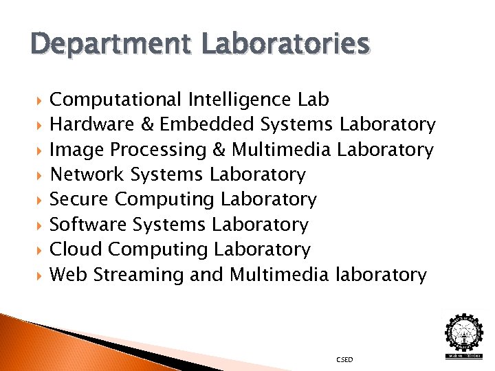 Department Laboratories Computational Intelligence Lab Hardware & Embedded Systems Laboratory Image Processing & Multimedia Laboratory Network Systems Laboratory Secure Computing Laboratory Software Systems Laboratory Cloud Computing Laboratory Web Streaming and Multimedia laboratory CSED