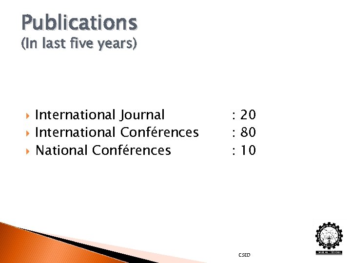 Publications (In last five years) International Journal International Conférences National Conférences : 20 : 80 : 10 CSED