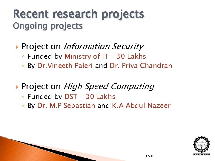 Recent research projects Ongoing projects Project on Information Security ◦ Funded by Ministry of IT – 30 Lakhs ◦ By Dr. Vineeth Paleri and Dr. Priya Chandran Project on High Speed Computing ◦ Funded by DST – 30 Lakhs ◦ By Dr. M. P Sebastian and K. A Abdul Nazeer CSED