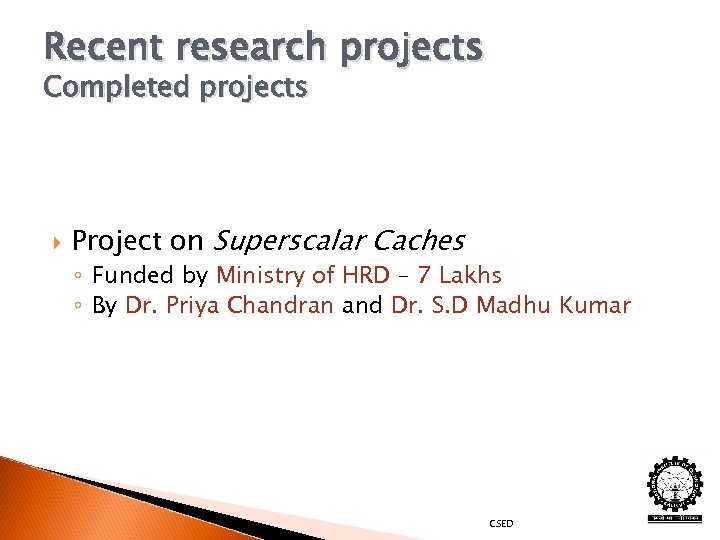 Recent research projects Completed projects Project on Superscalar Caches ◦ Funded by Ministry of HRD – 7 Lakhs ◦ By Dr. Priya Chandran and Dr. S. D Madhu Kumar CSED