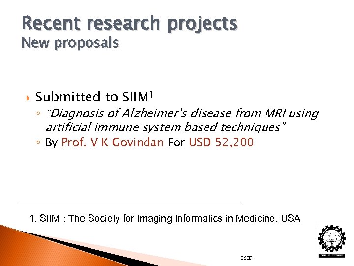 Recent research projects New proposals Submitted to SIIM 1 ◦ “Diagnosis of Alzheimer’s disease from MRI using artificial immune system based techniques” ◦ By Prof. V K Govindan For USD 52, 200 1. SIIM : The Society for Imaging Informatics in Medicine, USA CSED