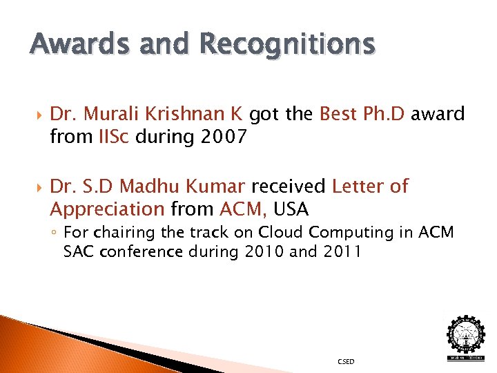 Awards and Recognitions Dr. Murali Krishnan K got the Best Ph. D award from IISc during 2007 Dr. S. D Madhu Kumar received Letter of Appreciation from ACM, USA ◦ For chairing the track on Cloud Computing in ACM SAC conference during 2010 and 2011 CSED
