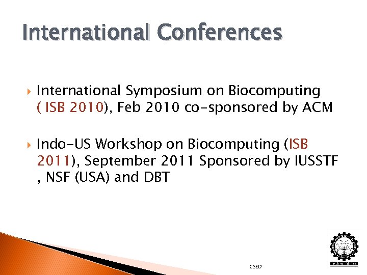 International Conferences International Symposium on Biocomputing ( ISB 2010), Feb 2010 co-sponsored by ACM Indo-US Workshop on Biocomputing (ISB 2011), September 2011 Sponsored by IUSSTF , NSF (USA) and DBT CSED