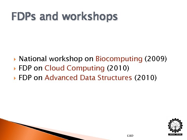 FDPs and workshops National workshop on Biocomputing (2009) FDP on Cloud Computing (2010) FDP on Advanced Data Structures (2010) CSED