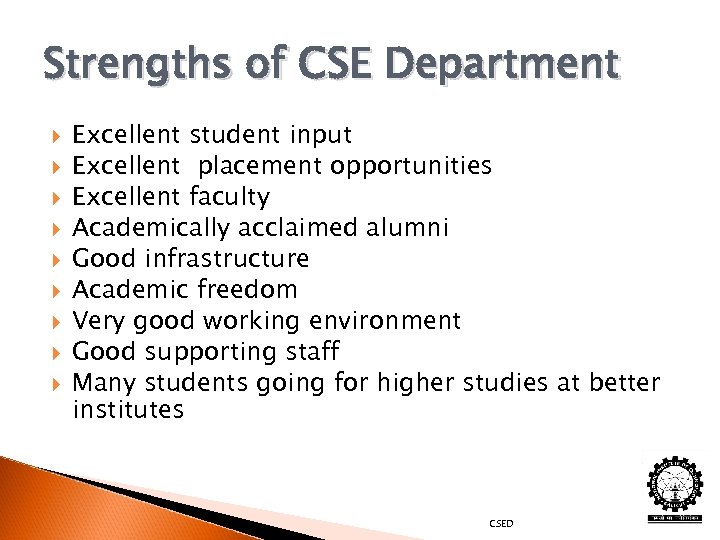 Strengths of CSE Department Excellent student input Excellent placement opportunities Excellent faculty Academically acclaimed alumni Good infrastructure Academic freedom Very good working environment Good supporting staff Many students going for higher studies at better institutes CSED