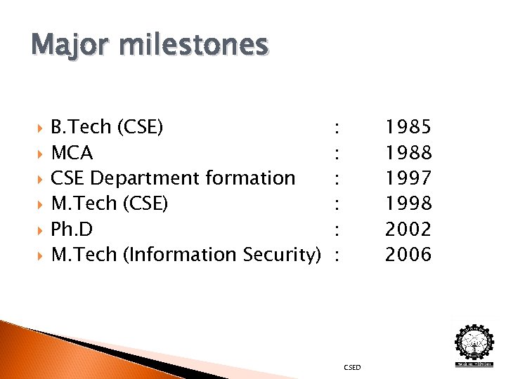 Major milestones B. Tech (CSE) MCA CSE Department formation M. Tech (CSE) Ph. D M. Tech (Information Security) : : : 1985 1988 1997 1998 2002 2006 CSED