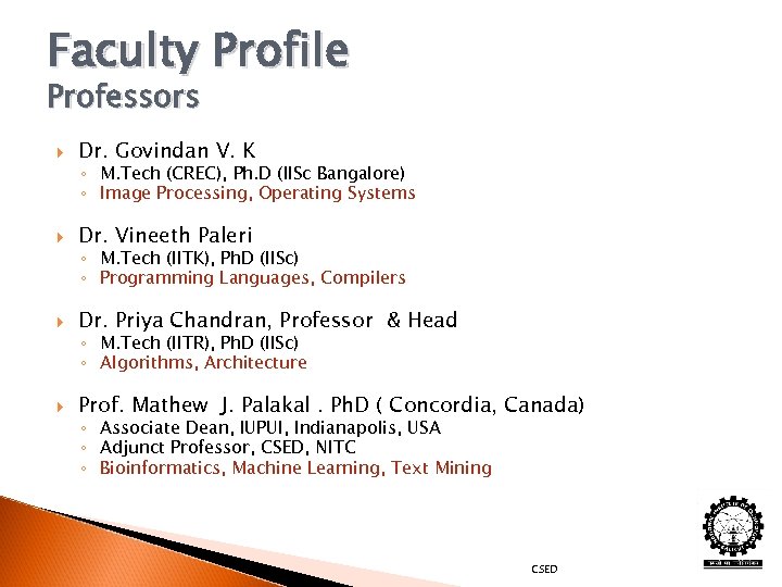 Faculty Profile Professors Dr. Govindan V. K Dr. Vineeth Paleri Dr. Priya Chandran, Professor & Head Prof. Mathew J. Palakal. Ph. D ( Concordia, Canada) ◦ M. Tech (CREC), Ph. D (IISc Bangalore) ◦ Image Processing, Operating Systems ◦ M. Tech (IITK), Ph. D (IISc) ◦ Programming Languages, Compilers ◦ M. Tech (IITR), Ph. D (IISc) ◦ Algorithms, Architecture ◦ Associate Dean, IUPUI, Indianapolis, USA ◦ Adjunct Professor, CSED, NITC ◦ Bioinformatics, Machine Learning, Text Mining CSED
