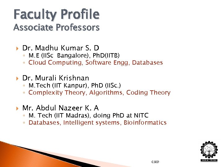 Faculty Profile Associate Professors Dr. Madhu Kumar S. D Dr. Murali Krishnan Mr. Abdul Nazeer K. A ◦ M. E (IISc Bangalore), Ph. D(IITB) ◦ Cloud Computing, Software Engg, Databases ◦ M. Tech (IIT Kanpur), Ph. D (IISc. ) ◦ Complexity Theory, Algorithms, Coding Theory ◦ M. Tech (IIT Madras), doing Ph. D at NITC ◦ Databases, Intelligent systems, Bioinformatics CSED