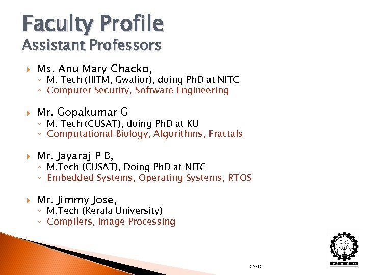 Faculty Profile Assistant Professors Ms. Anu Mary Chacko, Mr. Gopakumar G Mr. Jayaraj P B, Mr. Jimmy Jose, ◦ M. Tech (IIITM, Gwalior), doing Ph. D at NITC ◦ Computer Security, Software Engineering ◦ M. Tech (CUSAT), doing Ph. D at KU ◦ Computational Biology, Algorithms, Fractals ◦ M. Tech (CUSAT), Doing Ph. D at NITC ◦ Embedded Systems, Operating Systems, RTOS ◦ M. Tech (Kerala University) ◦ Compilers, Image Processing CSED