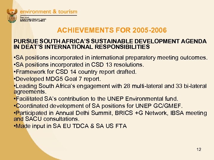 ACHIEVEMENTS FOR 2005 -2006 PURSUE SOUTH AFRICA’S SUSTAINABLE DEVELOPMENT AGENDA IN DEAT’S INTERNATIONAL RESPONSIBILITIES • SA positions incorporated in international preparatory meeting outcomes. • SA positions incorporated in CSD 13 resolutions. • Framework for CSD 14 country report drafted. • Developed MDG 5 Goal 7 report. • Leading South Africa’s engagement with 28 multi-lateral and 33 bi-lateral agreements. • Facilitated SA’s contribution to the UNEP Environmental fund. • Coordinated development of SA positions for UNEP GC/GMEF. • Participated in Annual Delhi Summit, BRICS +G Network, IBSA meeting and SACU consultations. • Made input in SA EU TDCA & SA US FTA 12