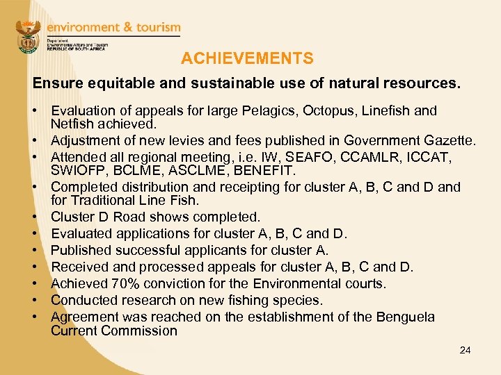 ACHIEVEMENTS Ensure equitable and sustainable use of natural resources. • Evaluation of appeals for large Pelagics, Octopus, Linefish and Netfish achieved. • Adjustment of new levies and fees published in Government Gazette. • Attended all regional meeting, i. e. IW, SEAFO, CCAMLR, ICCAT, SWIOFP, BCLME, ASCLME, BENEFIT. • Completed distribution and receipting for cluster A, B, C and D and for Traditional Line Fish. • Cluster D Road shows completed. • Evaluated applications for cluster A, B, C and D. • Published successful applicants for cluster A. • Received and processed appeals for cluster A, B, C and D. • Achieved 70% conviction for the Environmental courts. • Conducted research on new fishing species. • Agreement was reached on the establishment of the Benguela Current Commission 24