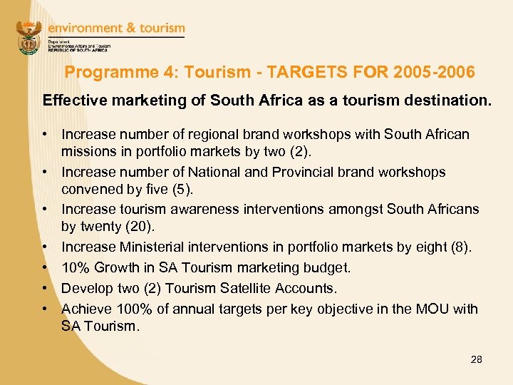 Programme 4: Tourism - TARGETS FOR 2005 -2006 Effective marketing of South Africa as a tourism destination. • Increase number of regional brand workshops with South African missions in portfolio markets by two (2). • Increase number of National and Provincial brand workshops convened by five (5). • Increase tourism awareness interventions amongst South Africans by twenty (20). • Increase Ministerial interventions in portfolio markets by eight (8). • 10% Growth in SA Tourism marketing budget. • Develop two (2) Tourism Satellite Accounts. • Achieve 100% of annual targets per key objective in the MOU with SA Tourism. 28