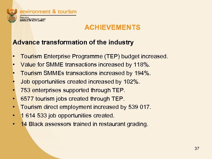 ACHIEVEMENTS Advance transformation of the industry • Tourism BEE Charter finalised and launched. • Tourism BEE Charter Council appointed announced by the Minister. • Tourism BEE Charter website completed (www. tourismbeecharter. co. za). • Tourism SMME training programme undertaken in all provinces. 36