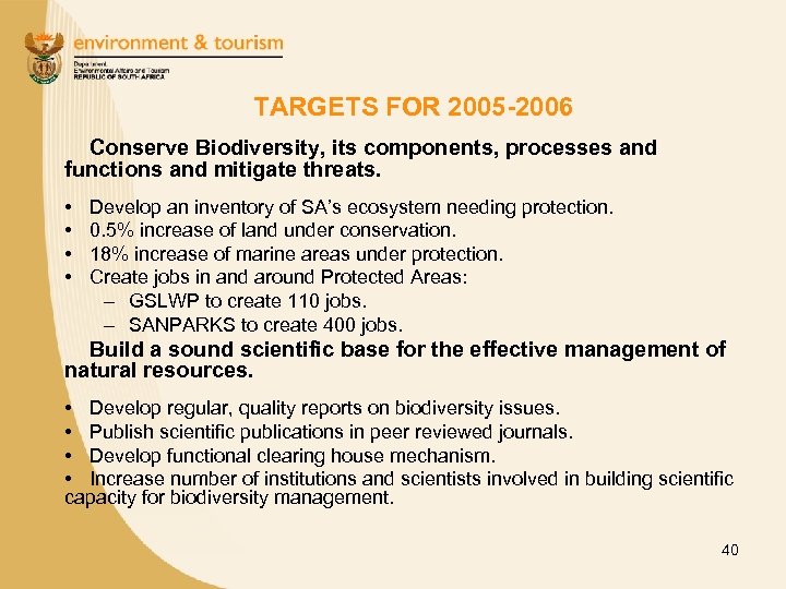 TARGETS FOR 2005 -2006 Conserve Biodiversity, its components, processes and functions and mitigate threats. • • Develop an inventory of SA’s ecosystem needing protection. 0. 5% increase of land under conservation. 18% increase of marine areas under protection. Create jobs in and around Protected Areas: – GSLWP to create 110 jobs. – SANPARKS to create 400 jobs. Build a sound scientific base for the effective management of natural resources. • Develop regular, quality reports on biodiversity issues. • Publish scientific publications in peer reviewed journals. • Develop functional clearing house mechanism. • Increase number of institutions and scientists involved in building scientific capacity for biodiversity management. 40