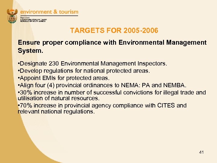 TARGETS FOR 2005 -2006 Ensure proper compliance with Environmental Management System. • Designate 230 Environmental Management Inspectors. • Develop regulations for national protected areas. • Appoint EMIs for protected areas. • Align four (4) provincial ordinances to NEMA: PA and NEMBA. • 30% increase in number of successful convictions for illegal trade and utilisation of natural resources. • 70% increase in provincial agency compliance with CITES and relevant national regulations. 41