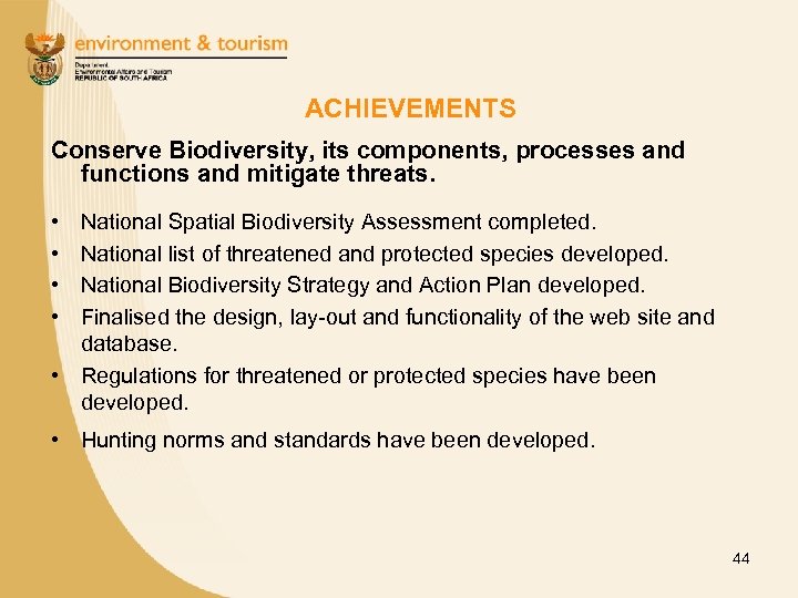 ACHIEVEMENTS Conserve Biodiversity, its components, processes and functions and mitigate threats. • • National Spatial Biodiversity Assessment completed. National list of threatened and protected species developed. National Biodiversity Strategy and Action Plan developed. Finalised the design, lay-out and functionality of the web site and database. • Regulations for threatened or protected species have been developed. • Hunting norms and standards have been developed. 44
