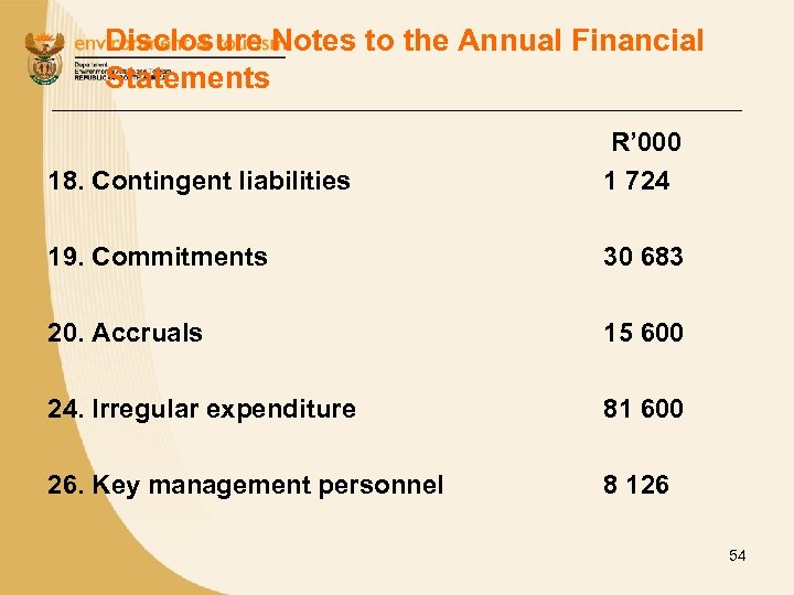 Disclosure Notes to the Annual Financial Statements 18. Contingent liabilities R’ 000 1 724 19. Commitments 30 683 20. Accruals 15 600 24. Irregular expenditure 81 600 26. Key management personnel 8 126 54