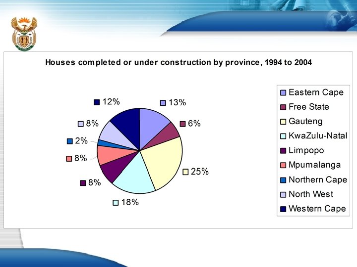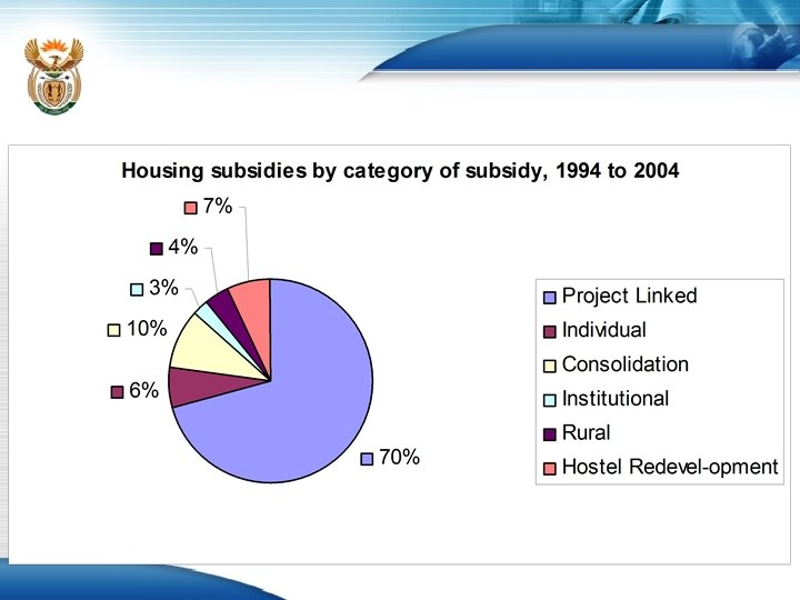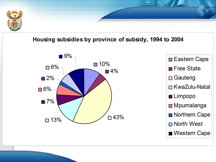 Housing Subsidy Grant (cont. ) • To date the programme has achieved a 51 % to 49 % split in allocation between female and male headed households • Between 1994 and March 2004 programme has made an investment and creation of assets of R 27, 6 bn by into low income communities