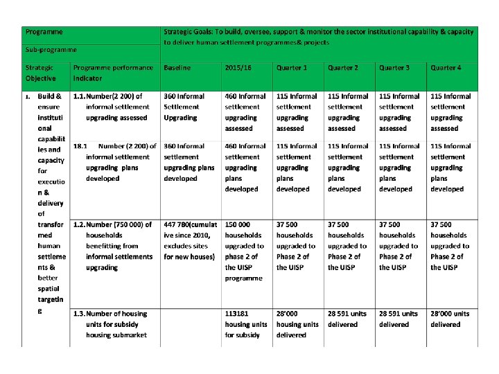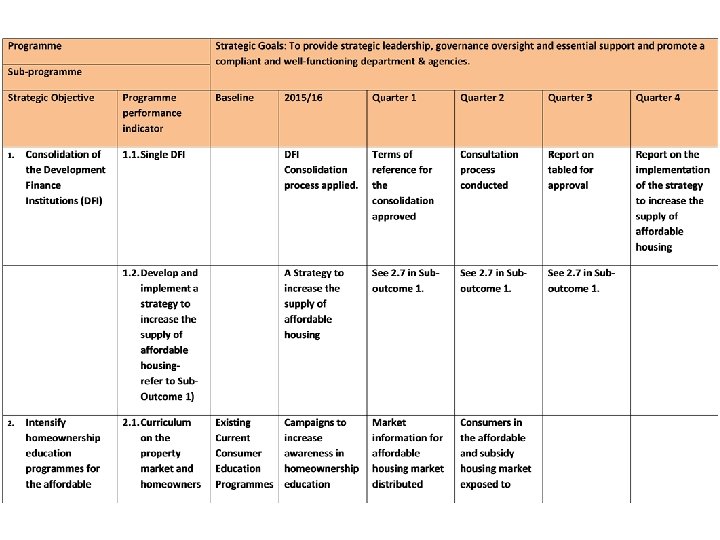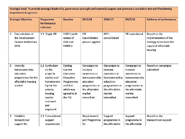 STRATEGIC GOALS BY PROGRAMMES Programme & Programme 1: Administration purpose Purpose: Provide strategic leadership, governance oversight and essential support and promote a compliant and well-functioning department & agencies Strategic Goal Provide strategic leadership, governance oversight and essential support and promote a compliant and well-functioning department & agencies Strategic objectives • • • Consolidation of the Development Finance Institutions (DFI) Intensify homeownership education programmes for the affordable housing market Establish transactional support for affordable housing market Monitor and reporting transactions in the secondary housing subsidy submarket Collect, analyse and disseminate information on property trends and values in the affordable housing market Issuing of title deeds form part of housing development process Analysis of new housing units constructed in the entire residential property market Fast track release of well-located land for housing and human settlements targeting poor and lower middle income household Utilize various communication platforms to communicate about the strategic thrust of human settlements