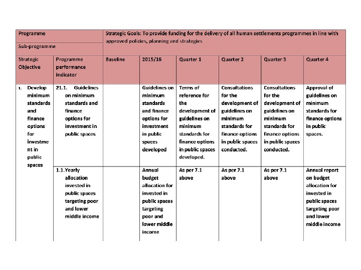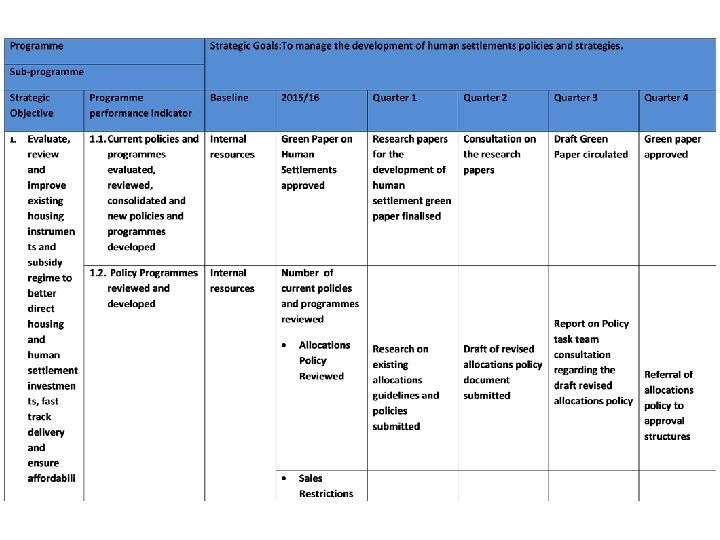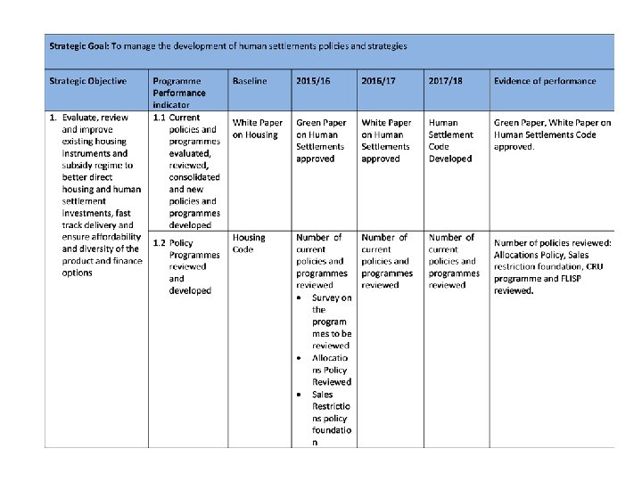 STRATEGIC GOALS BY PROGRAMMES Programme & purpose Programme 2: Human Settlements Strategy, Policy and Planning Purpose Manage the development of human settlement policies, strategies & planning Strategic Goal Development of human settlements policies, strategies & planning towards promoting adequate housing and improved quality living environments Strategic objectives • Develop policy and administrative systems that support individual transactions in the affordable secondary housing market • Strengthen programme for the accreditation of municipalities • Increase the supply of housing opportunities using different tenure types to ensure the diversity necessary to address social, economic and cultural needs • Mining Towns Strategy (A special Strategy for mine worker housing) • Increase Participation of stakeholders in housing development • Strengthen current mechanism to mobilize private sector to contribute to human settlements development • Develop horizontal and vertical consultative mechanisms among spheres of government • Review Planning System to achieve better spatial targeting