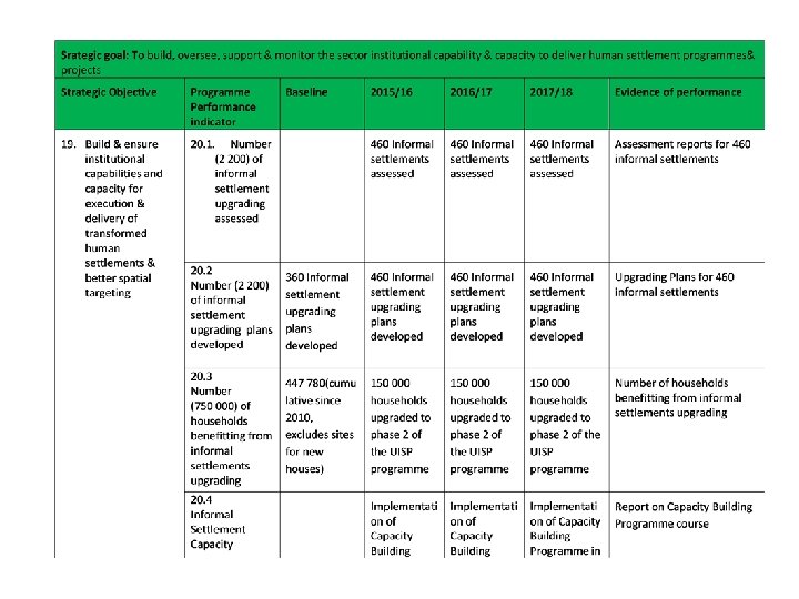 MACRO PERFROMAMNCE INDICATORS Macro Indicators Delivery Financing the Delivery Strategic Goal or Programme Most Closely Linked to the Achievement Indicator Programme 3: Programme Management Support Purpose Build, oversee, support & monitor the sector institutional capability & capacity to deliver human settlement programmes& projects Programme 4: Housing Development Finance Purpose Provide funding for the delivery of all human settlements programmes in line with approved policies, planning and strategies Target Estimates 2015/16 2016/17 2017/18 . 3 mill opportunities R 30. 9 bill R 33. 2 bill R 35. 2 bill