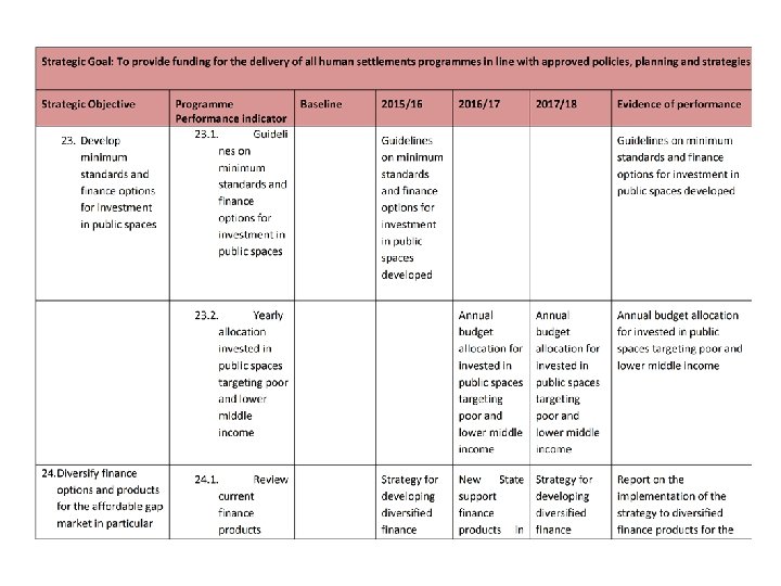 STRATEGIC GOALS BY PROGRAMMES Programme & purpose Programme 4: Housing Development Finance Purpose Provide funding for the delivery of all human settlements programmes in line with approved policies, planning and strategies Strategic Goal Provide funding for the delivery of all human settlements programmes in line with approved policies, planning and strategies Strategic objectives • • • Develop minimum standards and finance options for investment in public spaces Diversify finance options and products for the affordable gap market in particular Increase in the number of properties in the subsidy housing submarket entering the municipal rates roll