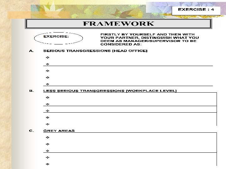 EXERCISE 3 n n A. DEFINE IN YOUR OWN WORDS THE PURPOSE OF DISCIPLINE. B. WHAT ARE THE PRINCIPLES OF HAVING A DISCIPLINARY CODE AND PROCEDURE?