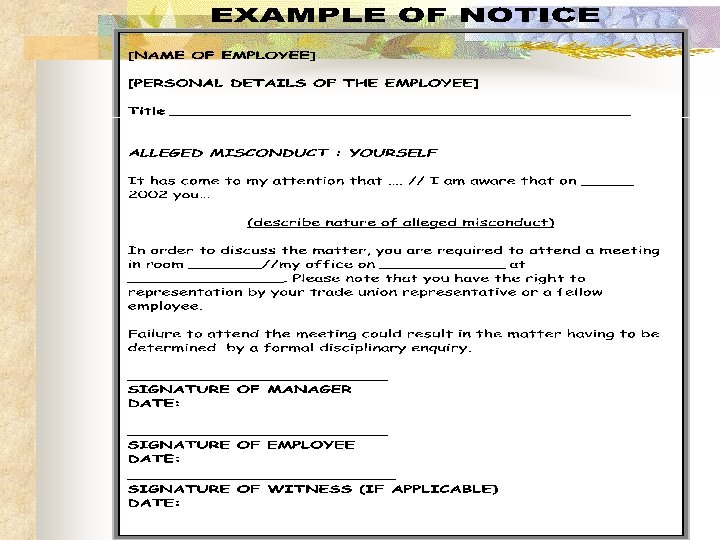 n Ø PROCEDURE TO BE FOLLOWED n Ø MEETING n - AUDI ALTERAM PARTEM - RIGHT TO BE REPRESENTED - DECISION G On what n n n NG Absent without permission and/or Absent without reason Not informing the office or institution