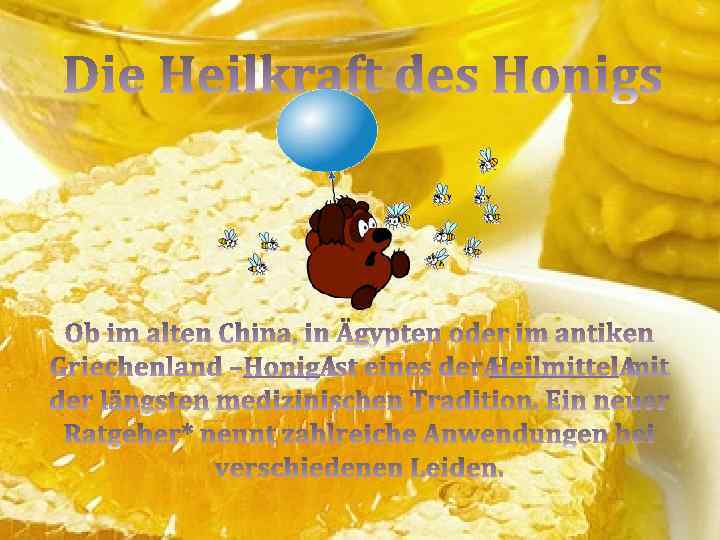 q Ø Ø Ø Ø Weitere typische Inhaltsstoffe sind: andere Zuckerarten Pollen Mineralstoffe Proteine Enzyme Aminosäuren Vitamine Farb- und Aromastoffe.