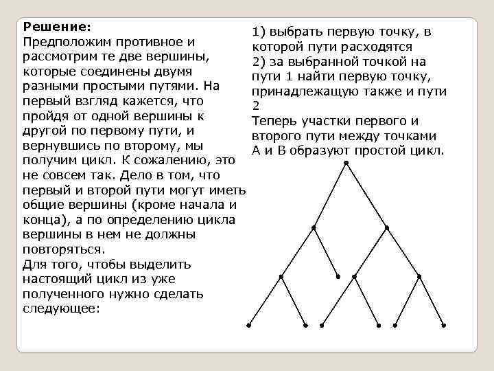 Решение: 1) выбрать первую точку, в Предположим противное и которой пути расходятся рассмотрим те две вершины, 2) за выбранной точкой на которые соединены двумя пути 1 найти первую точку, разными простыми путями. На принадлежащую также и пути первый взгляд кажется, что 2 пройдя от одной вершины к Теперь участки первого и другой по первому пути, и второго пути между точками вернувшись по второму, мы A и B образуют простой цикл. получим цикл. К сожалению, это не совсем так. Дело в том, что первый и второй пути могут иметь общие вершины (кроме начала и конца), а по определению цикла вершины в нем не должны повторяться. Для того, чтобы выделить настоящий цикл из уже полученного нужно сделать следующее: