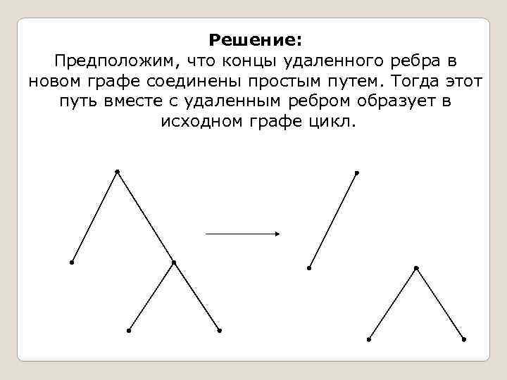 Решение: Предположим, что концы удаленного ребра в новом графе соединены простым путем. Тогда этот путь вместе с удаленным ребром образует в исходном графе цикл.