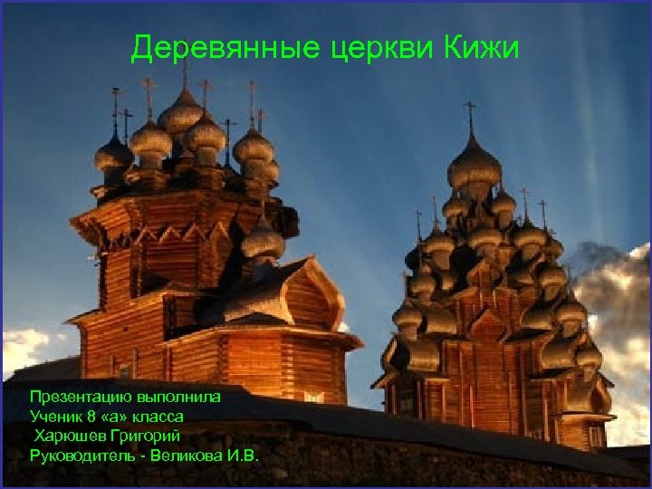 Деревянные церкви Кижи Презентацию выполнила Ученик 8 «а» класса Харюшев Григорий Руководитель - Великова И. В.