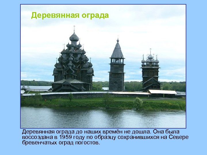 Деревянная ограда до наших времён не дошла. Она была воссоздана в 1959 году по образцу сохранившихся на Севере бревенчатых оград погостов.